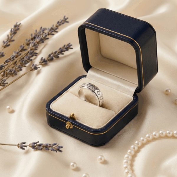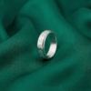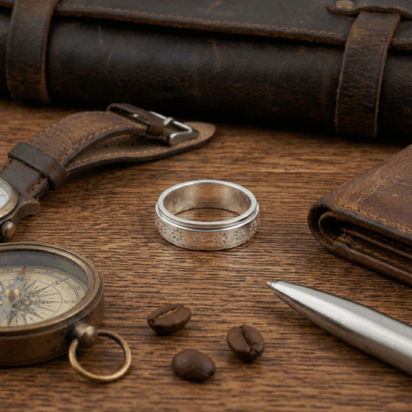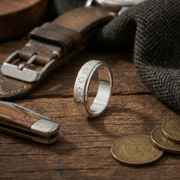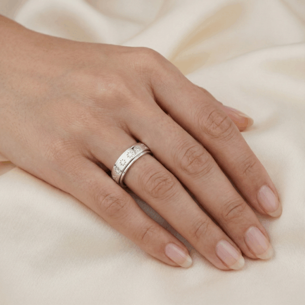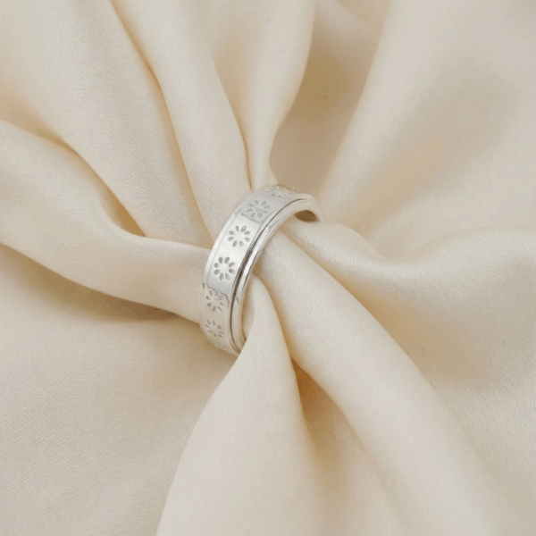 Thiết kế của nhẫn nổi bật với vòng xoay được khắc họa tiết hoa cúc tinh xảo, mỗi cánh hoa được chạm khắc tỉ mỉ, thể hiện sự chỉnh chu và tâm huyết trong từng chi tiết nhỏ. Đường nét mềm mại của hoa cúc kết hợp với bề mặt bạc được đánh bóng mịn màng, tạo nên một tổng thể hài hòa, vừa hiện đại vừa mang hơi hướng cổ điển.