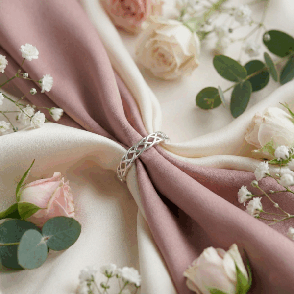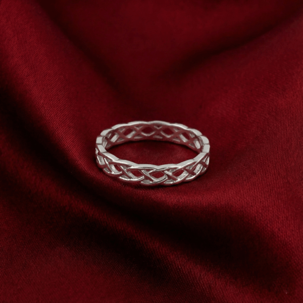 Chiếc nhẫn nổi bật với họa tiết nút thắt Celtic uốn lượn mềm mại quanh toàn bộ vòng nhẫn – biểu tượng của sự kết nối bất tận, tình yêu không điểm bắt đầu cũng chẳng có hồi kết. Mỗi đường nét đan xen tinh xảo như một lời cam kết cho sự bền lâu, vững chắc trong các mối quan hệ.