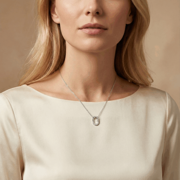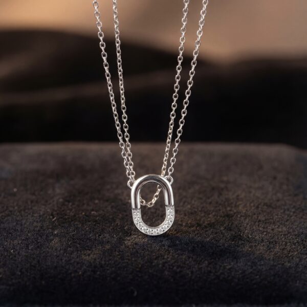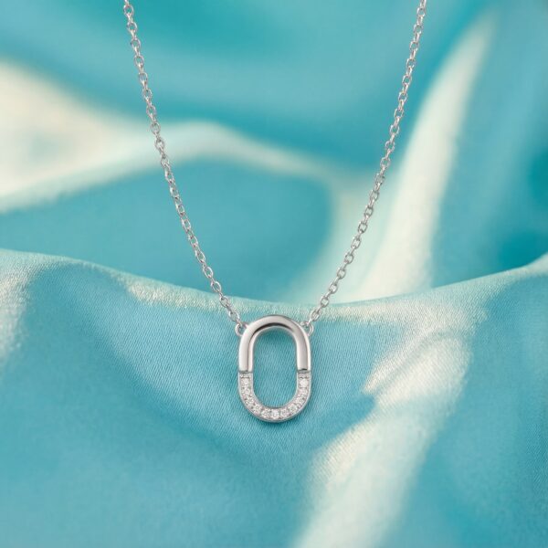 Điểm nhấn của sản phẩm là mặt dây chuyền hình chữ “O” được chế tác tinh xảo, với phần trên được đính một hàng đá cubic zirconia lấp lánh, mang lại vẻ sang trọng và cuốn hút. Bề mặt được đánh bóng mịn màng của mặt dây kết hợp hài hòa với dây chuyền bạc nhẹ, bền bỉ, đảm bảo sự thoải mái và phong cách suốt cả ngày dài.