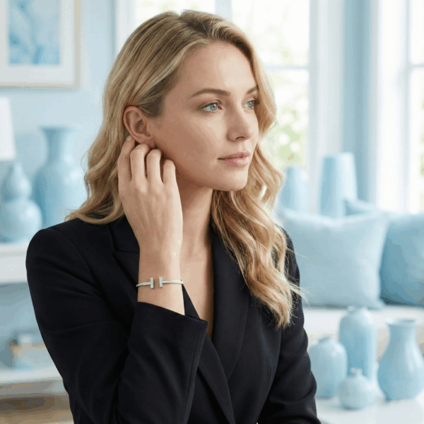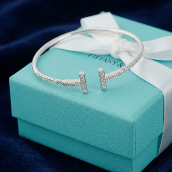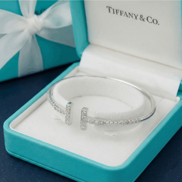 Chiếc lắc tay đến từ Tiffany & Co. mang thiết kế đặc trưng với biểu tượng “T” đôi đối xứng, đại diện cho sự tinh giản hiện đại và đẳng cấp vượt thời gian. Toàn bộ thân lắc được chế tác từ bạc cao cấp, đính đá lấp lánh tỉ mỉ theo từng đường nét, tạo nên vẻ ngoài sang trọng nhưng vẫn nhẹ nhàng, thanh lịch.