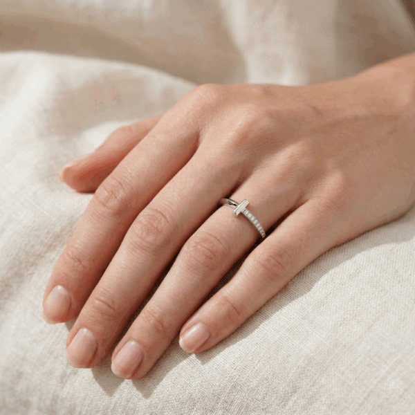Nhẫn Tiffany T Ring là biểu tượng của sự thanh lịch và hiện đại. Điểm nhấn là chi tiết chữ “T” độc đáo được chế tác sắc nét, kết hợp cùng hàng đá cubic zirconia lấp lánh được đính tỉ mỉ trên thân nhẫn, mang đến vẻ sang trọng và quý phái.
