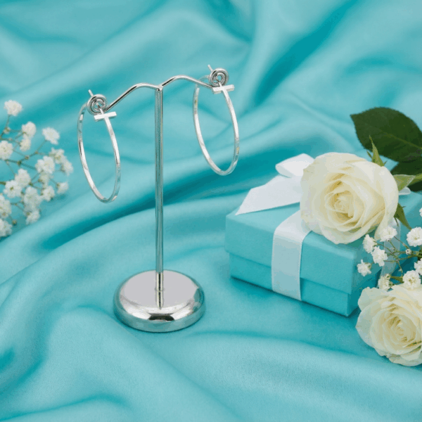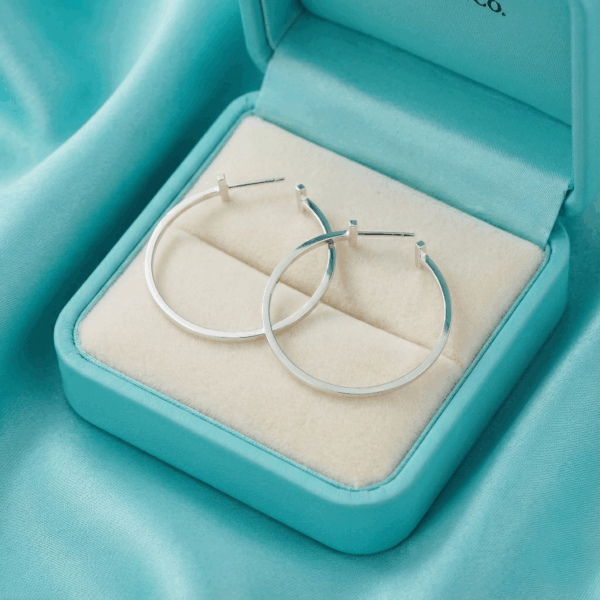 Mẫu khuyên tai Tiffany Wire Hoop Earrings là sự kết hợp giữa sự tối giản và phong cách hiện đại, được chế tác từ bạc 925 với độ bóng mịn hoàn hảo của thương hiệu Tiffany & Co.. Thiết kế nổi bật với hình dáng vòng tròn lớn, được điểm xuyết bởi các thanh ngang nhỏ đặt khéo léo ở hai bên, tạo nên nét độc đáo và khác biệt.