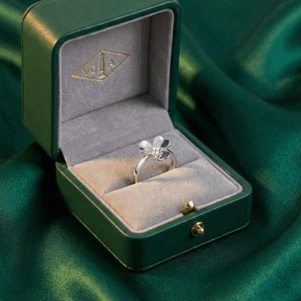 Bạn là tín đồ ưa thích mẫu thiết kế thương hiệu Van Cleef & Arpels thì đừng bỏ qua mẫu thiết kế nhẫn này. Frivole ring, 1 flower, small model – là thiết kế nhẫn hoa bốn cánh mang đến vẻ đẹp thanh khiết và đầy may mắn cho người đeo. Các cánh hoa được chế tác mềm mại, tỉ mỉ, tạo hiệu ứng cong tự nhiên, sống động như một bông hoa thật.